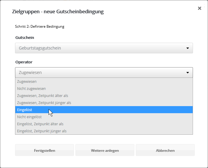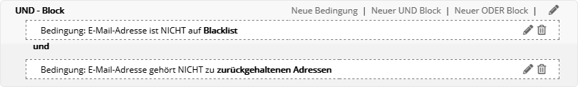 Insbesondere nach dem Kopieren einer vorhandenen Zielgruppe kann das sinnvoll sein, wenn die identischen Abonnenten in Original und Kopie nicht gewünscht sind. Bedingung anhand GutscheinFiltern Sie Abonnenten danach, ob und in welchem Zeitraum die Zuweisung oder Einlösung eines Gutscheins stattfand. Tipp: Um zugewiesene Gutscheine als eingelöst zu markieren, nutzen Sie entweder die Webservice-Funktion 'RedeemVoucherByCode' oder importieren in der Gutscheinübersicht eine CSV-Datei mit den eingelösten Gutscheincodes. Bedingung anhand SelektionMit diesem Bedingungstyp nutzen Sie eine per Webservice angelegte Selektion von Abonnenten als die Software-Zielgruppe. Der Bedingungstyp ist nur dann sichtbar, wenn per Webservice mindestens eine Selektion angelegt wurde. Das Besondere: In einer Selektion werden Abonnenten anhand einer Liste von IDs gruppiert. So lässt sich eine extern getroffene Abonnentenauswahl als Zielgruppe nutzen, ohne dass in den die Software-Abonnentendaten ein gemeinsames Merkmal vorliegen muss. Die Details entnehmen Sie bitte der Webservice-Dokumentation, die wir Ihnen gern zusenden. Bedingung anhand des Empfängers (geplant)Diese Bedingung entscheidet, ob ein Abonnent als Empfänger eines bestimmten Mailings vorgesehen war oder nicht. Das bedeutet, dass er in einer Abonnentenliste bzw. Zielgruppe für ein bestimmtes Mailing steht, welches versandt wurde. Im Unterschied zur letztgenannten Bedingung wird der tatsächliche Empfang jedoch nicht geprüft. Es sind auch alle Empfänger enthalten, die das Mailing z. B. aufgrund von Bounces, Blacklists oder serversseitigen Spamfiltern nicht empfangen haben. Bedingung anhand des Empfangens (zugestellt)Diese Bedingung entscheidet, ob jemand ein bestimmtes Mailing empfangen hat oder nicht. Das Mailing gilt als empfangen, wenn der E-Mail-Server des Abonnenten eine positive Rückmeldung erteilt hat. Im Schritt nach dem Empfang ist es dennoch möglich, dass das Mailing beim Empfänger in einem Spamordner landet. Bedingung anhand des BounceverhaltensDamit legen Sie Bedingungen anhand der Zustellungen oder Nichtzustellungen eines bestimmten Mailings an. Bedingung anhand Blacklist bzw. Zurückgehaltener AdressenAbonnenten, deren E-Mail-Adresse auf einer Blacklist oder der Liste der zurückgehaltenen Adressen steht, werden automatisch vom Versand ausgeschlossen. Dieselben* Abonnenten lassen sich per Zielgruppe filtern, etwa um sie beim Export Ihrer Abonnentendaten ebenfalls auszuschließen. Die kombinierte Zielgruppe sieht wie folgt aus: