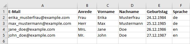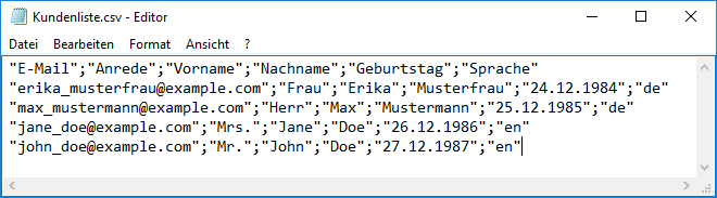 Abonnenten: ImportWahrscheinlich haben Sie bereits eine Liste von Adressen zusammengestellt, die Sie per Newsletter anschreiben möchten. Über das universelle CSV-Dateiformat lassen sich Ihre Adressen aus nahezu jeder Datenbank oder Tabellenkalkulation (z. B. Microsoft Office oder Open Office) exportieren und anschließend in die Software importieren. Um die Zuordnung der Spalten (z. B. Vorname, Nachname, E-Mail) beim Import zu erleichtern, sollte die erste Zeile Ihrer CSV-Datei aussagekräftige Spaltenüberschriftten enthalten. Ein Beispiel: