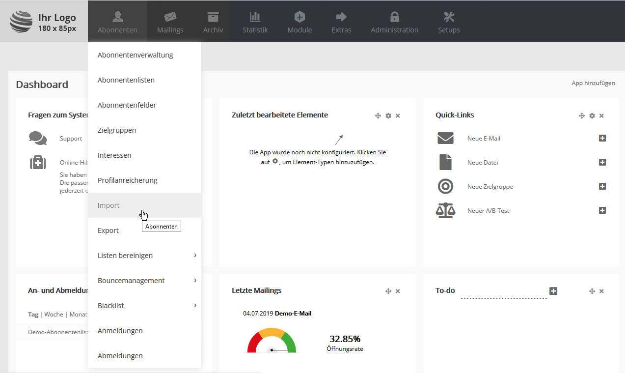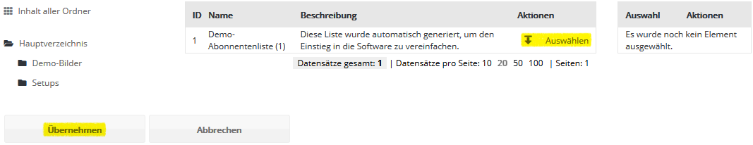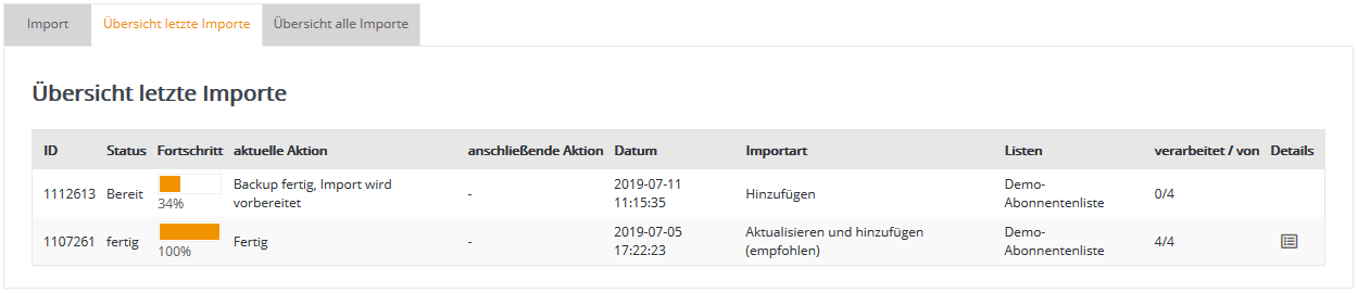 Schritt 3 - AbonnentenlistenWählen Sie nun aus, in welche die Software Abonnentenliste ihre CSV-Datei importiert werden soll. Falls Sie zuvor keine eigene Abonnentenliste in die Software angelegt haben (siehe Menü Abonnentenlisten), steht zum schnellen Einstieg die leere Abonnentenliste 'Demo-Liste' bereit. Diese Liste wird in der Regel bei der Einrichtung Ihres die Software Kontos angelegt und zur Demonstration mit einem Beispiel-Abonnenten befüllt.