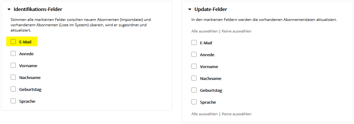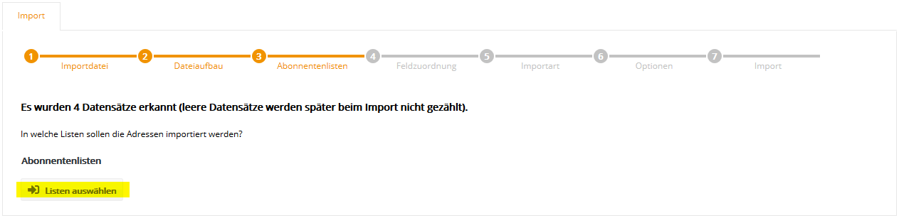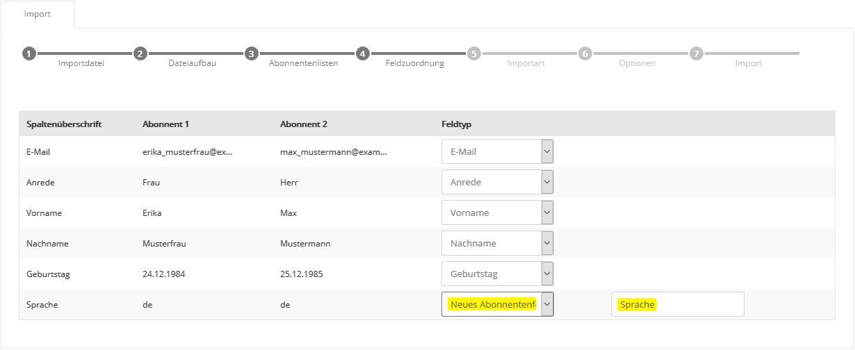 Auch die Auswahl mehrerer Abonnentenlisten ist möglich, falls Sie parallel in mehrere Listen importieren möchten. Klicken Sie nach Auswahl der gewünschten Liste(n) auf 'Übernehmen' und anschließend auf 'Weiter'. Der Name einer Abonnentenliste lässt sich im Menü Abonnentenlisten auch nachträglich jederzeit ändern. Schritt 4 - FeldzuordnungIn Schritt 4 teilen Sie die Software mit, welche Spalte (z.B. Vorname, Nachname) Ihrer CSV-Datei in welches die Software Abonnentenfeld importiert werden soll. Zum schnellen Einstieg sind typische Abonnentenfelder wie 'E-Mail', 'Anrede', 'Vorname' und 'Nachname' in die Software bereits vorhanden.
