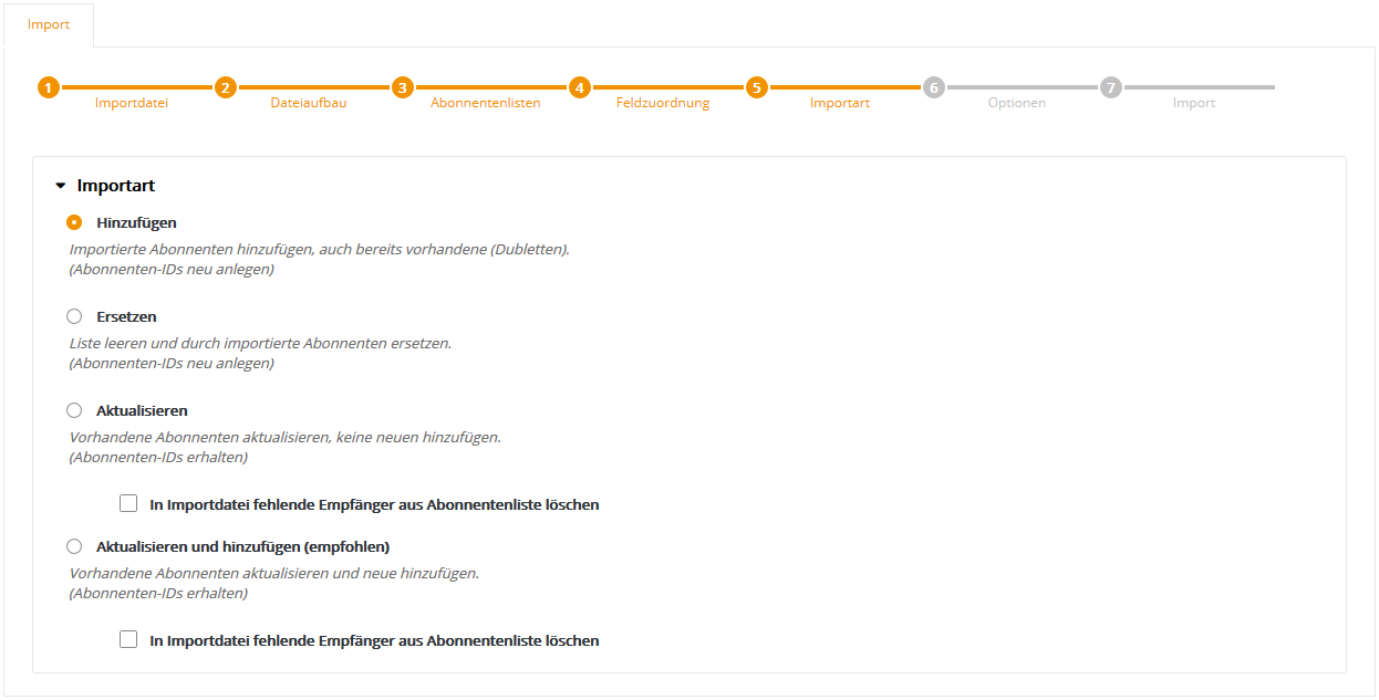 Auf der linken Seite sehen Sie am Beispiel der ersten beiden Abonnenten noch einmal den Inhalt Ihrer CSV-Datei. Auf der rechten Seite wählen Sie bitte den 'Feldtyp', der zum jeweiligen Inhalt passt. Dabei übernimmt die Software die Zuordnung automatisch, wenn der Name von CSV-Spaltenüberschrift und die Software-Abonnentenfeld übereinstimmt. Wird automatisch kein passendes Abonnentenfeld gefunden, ist der neue Feldinhalt zunächst auf 'nicht importieren' gesetzt. Wählen Sie in dem Fall entweder eines der vorhandenen Felder aus, oder nutzen Sie die Option 'neues Abonnentenfeld', um ein neues Feld anzulegen und ihm einen Namen zu geben. An dieser Stelle erhalten neue Felder grundsätzlich den Typ 'mehrzeiliger Text', siehe auch nachfolgender Tipp. Klicken Sie anschließend auf 'Weiter'. --> Tipp: Idealerweise sollten Sie sich bereits vor dem Import einmalig die Zeit nehmen, im die Software Menü 'Abonnentenfelder' alle Felder so anzulegen, dass Feldname und Feldtyp zu Ihren importierten Daten passen. Damit profitieren Sie zukünftig von der automatischen Feld-Zuordnung, was bei wiederkehrenden Importen nicht nur Zeit spart, sondern auch eventuelle Fehler durch unpassende Feldtypen oder die manuelle Feld-Zuordnung verhindert. Schritt 5 - ImportartHier legen Sie fest, wie Ihre neu importierten Daten mit den vorhandenen 'alten' Daten der gewählten die Software-Abonnentenliste(n) abgeglichen werden sollen.