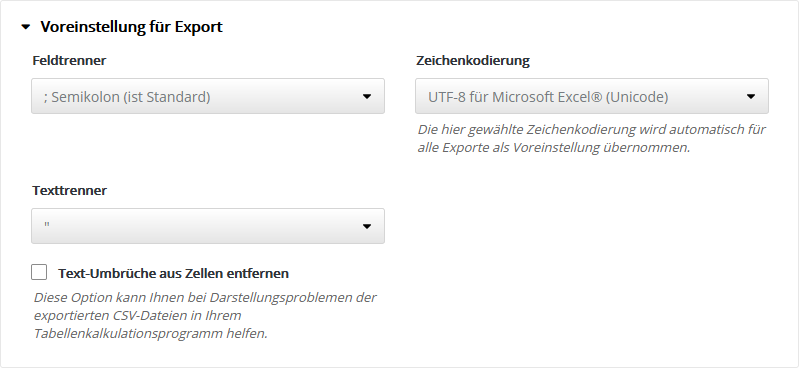 Folgende 'HTML-Editoren' sind in die Software integriert und nutzbar: Grundeinstellung ExportHier legen Sie die Voreinstellung für den Export von CSV-Dateien fest, z. B. für den Export von Abonnentendaten. Bei der Durchführung jedes Exportes können Sie bei Bedarf auch eine abweichende Einstellung wählen. Standardeinstellung ist die Option 'UTF-8 für Microsoft Excel® (Unicode)', technisch gesprochen 'UTF-8 mit BOM'. Dieses Format wird von den meisten Officeanwendungen automatisch erkannt, so dass Umlaute und Sonderzeichen ohne manuelle Formatwahl korrekt importiert werden. StatistikeinstellungenTragen Sie Ihre eigenen Maximalwerte ein, um die rot|gelb|grün Farb-Umschaltung der Statistik-Anzeige für Öffungsrate, Klickrate und Bouncerate an die typischen Werte Ihrer Mailings anzupassen. Nur Ihre besten Mailings sollten den grünen Bereich erreichen. Die Farb-Umschaltung erfolgt automatisch in Drittel-Stufen des eingetragenen Maximalwertes. Empfehlung: Notieren Sie aus der Statistik Ihrer bisherigen Mailings die Durchschnittswerte für Öffnungsrate, Klickrate und Bounces. Damit dieser Durchschnittswert zukünftig im mittleren Drittel der Skala landet, tragen Sie das Doppelte dieses Wertes als Maximum in das jeweilige Feld ein. Tragen Sie z. B. 30% als Maximum ein, dann werden anschließend die Werte bis 10% rot, bis 20% gelb und darüberliegende Werte grün gefärbt. Sie sehen sofort, ob Ihr aktuelles Mailing über- oder unterdurchschnittlich abschneidet. Typische Durchschnittswerte: