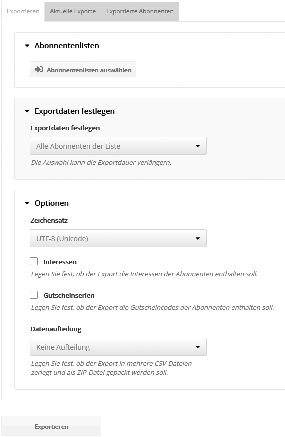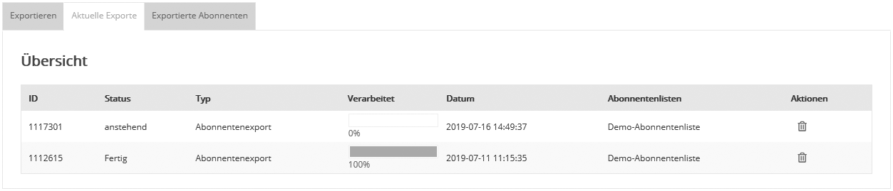Durch Klick auf die Schaltfläche 'Exportieren' startet die Software den Export und wechselt zu 'Aktuelle Exporte'. Hier sehen Sie den Fortschritt des aktuellen Exports. Dem Verlaufsbalken sowie dem jeweils angezeigten Status entnehmen Sie, wann der Export erfolgreich abgeschlossen ist. Im Reiter 'Exportierte Abonnenten' finden sie die Export-Datei, die Sie nach einem Klick auf 'Download' auf Ihrem Computer speichern können.
