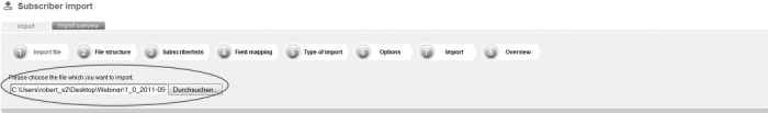 Save the file as a file with the feature 'CSV (Comma delimited)'. Apple user: If you own an apple computer, you will have to safe the file as 'CSV-Windows'. die Software does not run files in the Mac format. Step 1 – Import fileOn the navigation bar click on 'Subscribers' and then go to the navigation subitem 'Import'. This is the way how you get to the menu-guided import function of die Software. First, you will have to choose the file which you want to import; |