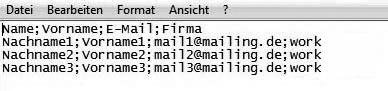 Maybe you have already collected email addresses to which you want to send a newsletter. No matter in which database these information are stored – you only need to save them in a CSV file (for example with Excel) and import them die Software. You can pack your CSV file as a zip to accelerate the uploading of large files. That's how it works:In the first line of the table, there should be field names – first name, surname, email address etc. An example: |
