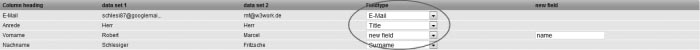 if the first line of your address file contains (as shown in the example above) the column headings, leave the item 'First line contains column headings' marked . Otherwise, if your address file starts right away with the subscriber data, unmark this option. Step 3 – Subscriber ListsChoose the subscriber list to which you want to import the addresses. Subsequently click on 'Next'. Step 4 – Field MappingNow you are asked to match the field names of your subscriber data with those of die Software. In order to do so, please choose in the drop down menus the associations which correspond to field information displayed to the left of these menus. If there does not exist a matching subscriber field, choose 'New Field' and enter a name for the subscriber field that needs to be created. Click 'Next'.