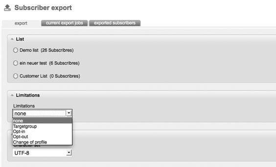 Subscribers lists can be exported from die Software as CSV – files. An advantage, for example, is that you can back up the address lists in this way. In the tab 'Export’, you can make choices of the lists that have to be exported. Per export only one subscriber list can be chosen. If you only want to export certain data records, you can decide on 'Limitations’. |