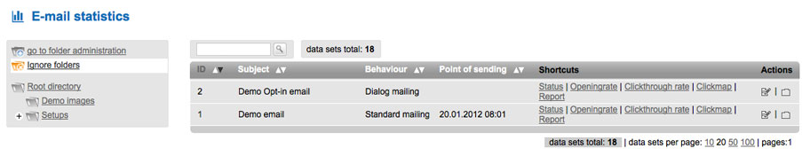 Here you find the statistics of all sent mails. For easier access die Software already includes a demo-mail you can view. |
