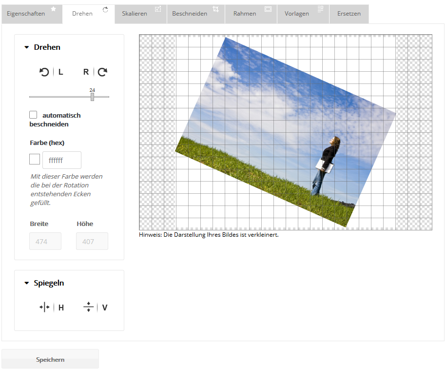 - es stehen Bildbearbeitungsfunktionen zur Verfügung, wie Zuschneiden, Drehen, Skalieren
