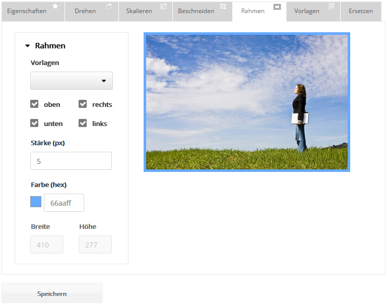 Sie können Ihrem Bild einen Rahmen beliebiger Farbe und Breite geben. Weiterhin können Sie festlegen, ob der Rahmen das gesamte Bild umschließen soll oder beispielsweise nur am rechten und linken Bildrand erscheinen soll.
