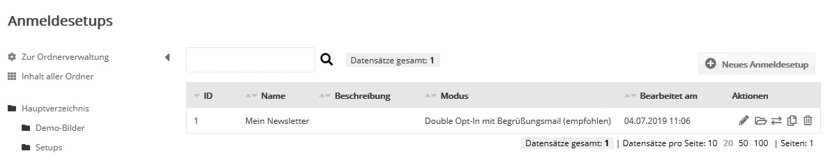 Setups: AnmeldesetupIm Menü 'Anmeldesetup' erstellen Sie Anmeldeformulare zur Einbindung auf Ihrer Website. Die Felder ordnen Sie per Drag&Drop an. Den Formular-Quellcode für Ihre Website erzeugt die Software automatisch. Zum schnellen Einstieg enthält die Software ein Demo-Anmeldesetup. Die vorhandene Setups lassen sich über die Symbole'Bearbeiten', in Unterordner 'Verschieben' oder 'Kopieren' und über das Papierkorb-Symbol 'Löschen'.