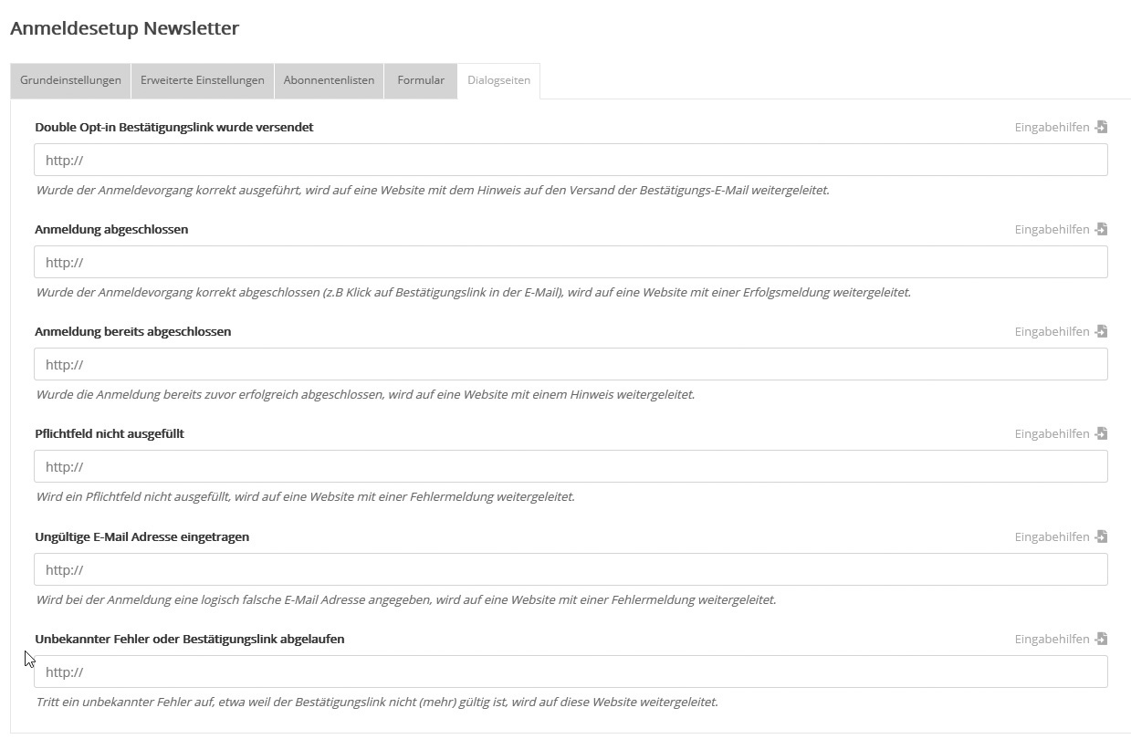 Um eine bestimmte Mail als Opt-In-Nachricht oder zur Begrüßung auszuwählen, muss im jeweiligen Mailing unter 'Erweiterte Einstellungen' --> 'Verhalten' der Typ 'Dialog-Mail' eingestellt sein. Sie können sich Kopien der Dialogmails zum Nachweis der Anmeldung an eine oder mehrere (per Komma oder Semikolon getrennte) E-Mail-Adresse(n) zuschicken lassen. Erweiterte EinstellungenE-Mail Weiterleitung HTTP-Weiterleitung Beispiel-Eingabe:
