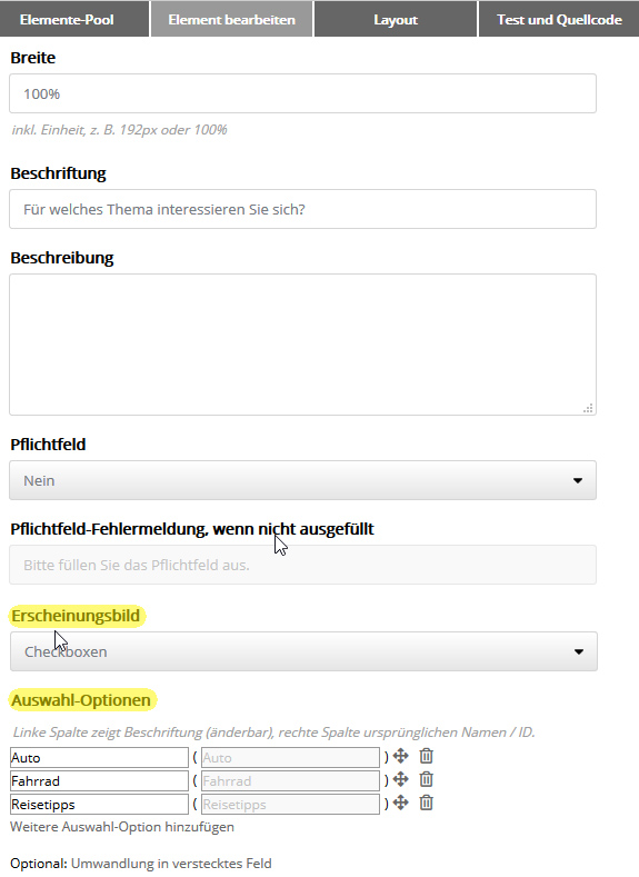 Als Erscheinungsbild wählen Sie entweder 'Auswahlliste' oder 'Checkboxen' (Einfachauswahl) bzw. 'Radiobuttons' (Mehrfachauswahl). Im Bereich 'Auswahl-Optionen' legen Sie fest, ob alle oder nur bestimmte Feld-Optionen (bzw. Listen oder Setups) im Formular angeboten werden. Über die Symbole ganz rechts ändern Sie die Reihenfolge der Optionen per Drag&Drop oder blenden Optionen aus. In der linken Spalte der Tabelle passen Sie die Bennenung jeder Option an, mit der sie in der Auswahlliste auftauchen soll. Auf der rechten Seite sehen Sie zur Information (nicht änderbar) den ursprünglichen Name (Wert) der Feld-Option. Im Fall einer Listen- oder Setup-Auswahl wird die ID angezeigt. Über den Link 'Weitere Auswahl-Option hinzufügen' lassen sich bisher ausgeblendete oder neu hinzugekommene Optionen jederzeit der Auswahl hinzufügen.